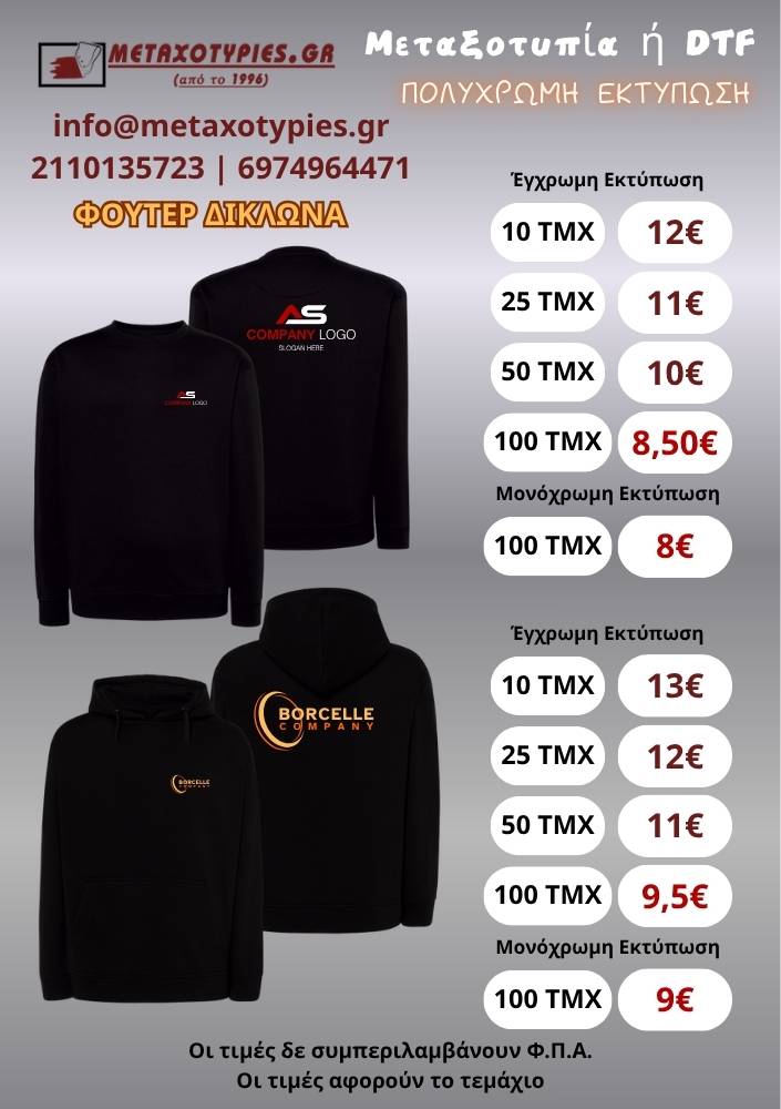 Ειδικευόμαστε στην εκτύπωση χρησιμοποιώντας ψηφιακή εκτύπωση, sublimation, pigment, offset, laser και μεταξοτυπία.